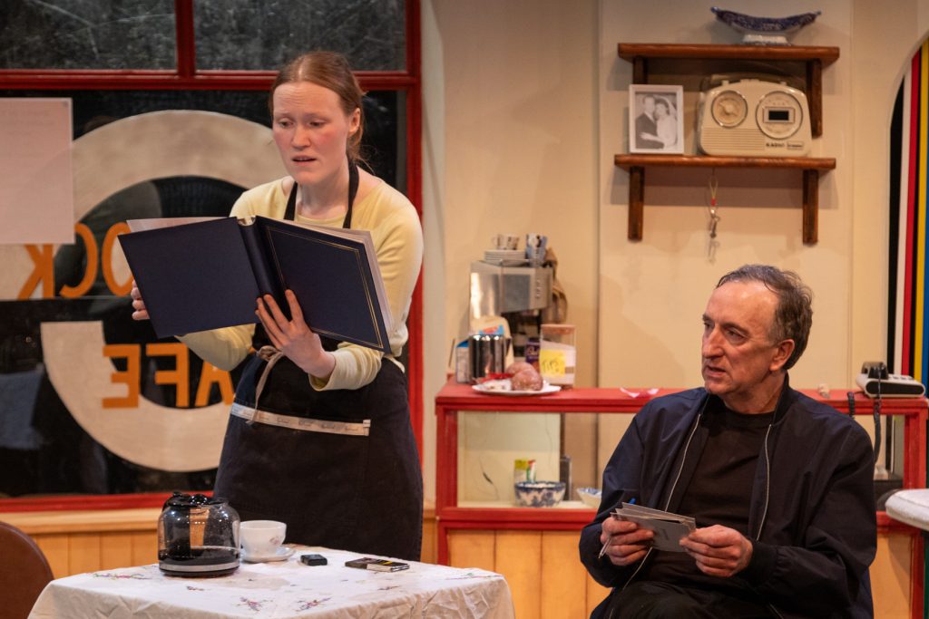The action unfolds in The Dock, a rundown café that doubles as temporary lodging, its laminate counter and oilcloth tables anchoring the space in social and emotional stasis. The play’s initial soundscape confirms what the setting suggests. From the audience’s first encounter, the opening bars of Brenda Lee’s As Usual establish a tone of quiet resignation and mundanity, a mood that underpins a drama concerned with lives that have slipped out of alignment. Roche traces the fragile narratives his characters construct — fantasies of escape, reinvention, or deferred success — to endure absence, while revealing the narrow limits within which change may occur. A strain of determinism — familiar from Roche’s wider body of work — runs beneath the play’s naturalistic surface. Under Peter McCamley’s assured direction, this pressure is not played as static but as rhythmically alive on stage. The linear structure helps and the closed setting emphasise how these lives are moulded less by decisive choice than by overlapping social, emotional, and economic pressures.
