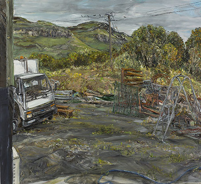 More recently, the decommissioned truck itself has become a subject, along with the piles of metal that surround it. In the recent Yard paintings, the artist has started to address the view from his studio door as well as repeated views of the mountain from the truck’s now static position. In the contrast between metal and nature in Miller’s work, we are really confronted with wider questions of our relationship between culture and nature. The repeated cycles of life, growth and death are closer to real permanence than metal or machine. Beauty is found equally in the rusting man-made remnants of human construction, and in the rising mountain landscape of Ben Bulben. But in Miller’s work the pervading intensity of the natural world seems always to hold dominance over our temporary endeavours. We sense from the paintings, that whatever we do or try to do, it will, given time, be re-absorbed by the natural world.